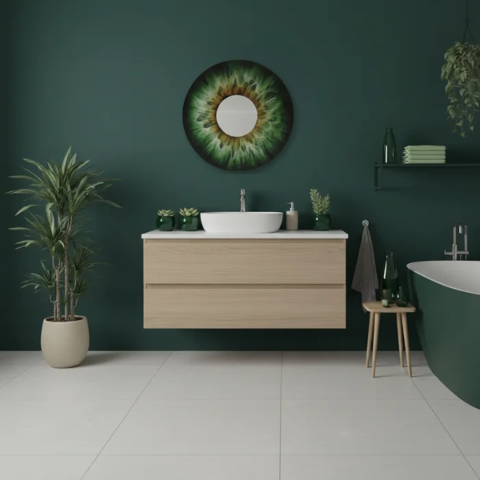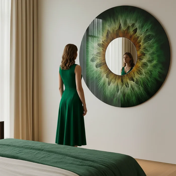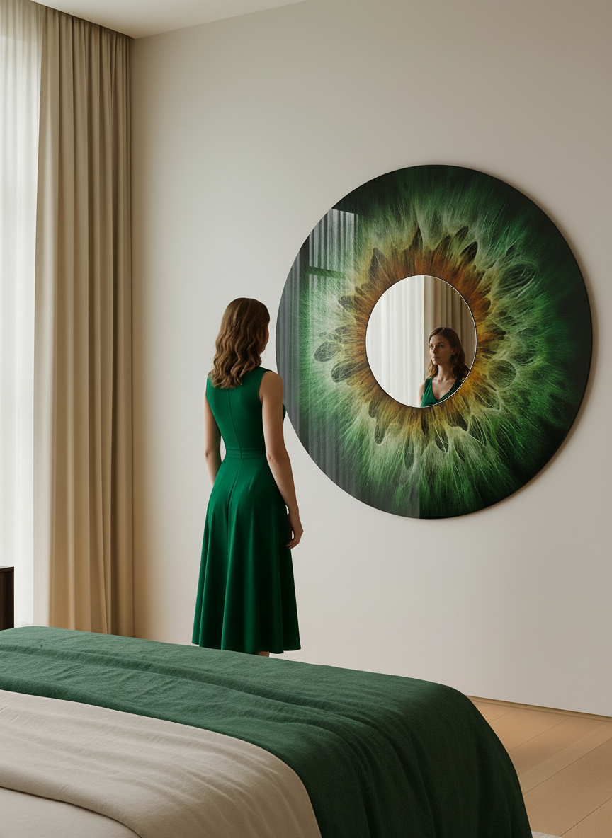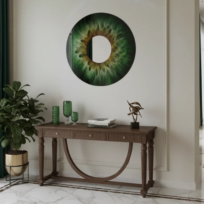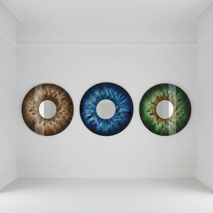 80 cm diameter • 4 mm tempered safety glass • museum-quality high-gloss finish with exceptional scratch and heat resistance • rear-side UV printing with vivid colour rendering, created using the client’s own iris photograph • centrally mounted mirror element • dual metal hanging brackets for secure installation • 5-year indoor warranty