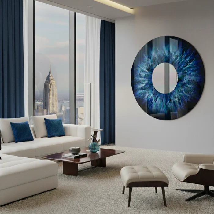 120 cm diameter • 4 mm tempered safety glass • museum-quality high-gloss finish with exceptional scratch and heat resistance • rear-side UV printing with vivid colour rendering, created using the client’s own iris photograph • centrally mounted mirror element • dual metal hanging brackets for secure installation • 5-year indoor warranty