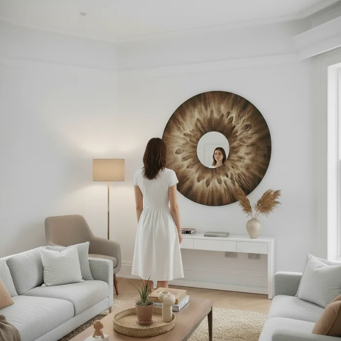 When a 120 cm Soul Mirror (Grand Edition) is commissioned, clients may order smaller mirrors from the collection at a special reduced rate of 50% off their standard price. This option allows the creation of harmonious multi-piece arrangements within the home, while maintaining the unified artistic language of the original iris photograph.