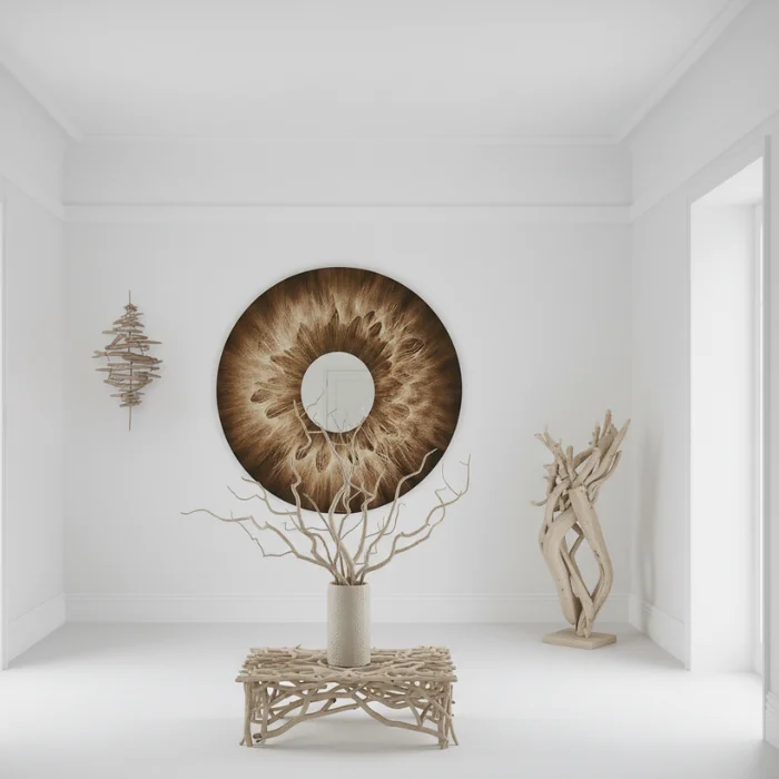 In the Gaia Collection, driftwood compositions complement each artwork, blending natural forms and textures into its atmosphere as if nature itself were extending beyond the piece.